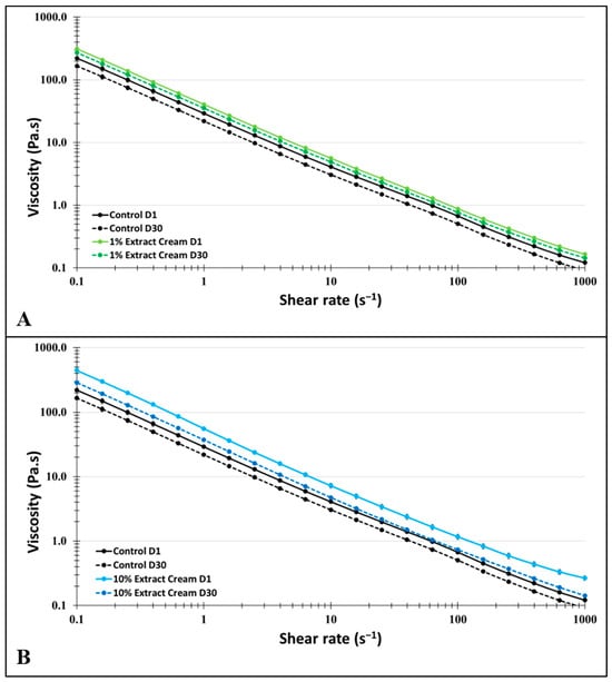 To assess the flow properties of creams, continuous shear flow tests were conducted using a sanded cone–plate geometry (4° angle, 40 mm diameter). Apparent viscosity values were recorded by subjecting the samples to increasing shear rates ranging from 0.1 to 1000 s−1 for a duration of 150 s.