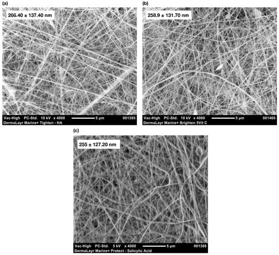 In vitro evaluations of DermaLayr™ NF products: SEM characterizations of (a) DermaLayr™ Marine+ Tighten; (b) DermaLayr™ Marine⁺ Brighten 5Vit C; (c) DermaLayr™ Marine⁺ Protect 2SA.