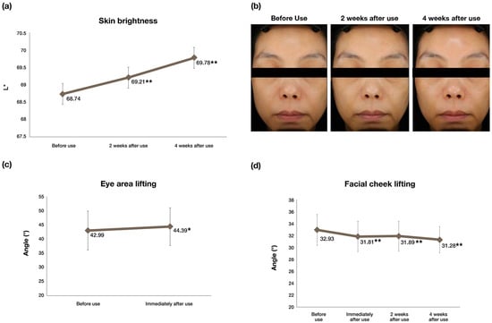 A total of 23 subjects were enrolled for this study and all the subjects completed the study. The measurements recorded for the tested parameters are presented in Table 5 and Table 6. Skin brightness, as measured using VISIA®, was expressed using the L* value (luminosity). The higher the L* value, the better the perceived skin brightness []. A significant increase of 0.68% (p < 0.01) and 1.51% in skin brightness (p < 0.01) was observed after 2 weeks and 4 weeks of using the test product, compared to the condition before use, as shown in Figure 3a,b. The lifting effect was determined by measuring the angle of the contour lines in the cheek or the eye regions, respectively. Eye and facial skin lifting were analyzed as described previously by Saito et al. []. Eye lifting measurements were performed by measuring the angle of the contour line from the captured contour image using the image analysis program. As the angle between the two lines increases, there is a lifting effect. Cheek lifting measurements were performed by drawing a straight line through the circle formed near the cheekbones and measuring the angle formed with the straight line drawn across the mouth. As the angle between the two straight lines decreases (decreased sagginess), it can be considered that there is an improvement effect on the facial (cheek) lifting []. Figure 3c shows that compared to baseline (before use of the test product), there was a significant increase (p < 0.05) in lifting around the eyes immediately after use of the test product. Also, there was a significant improvement (p < 0.01) in facial lifting after 2 weeks and 4 weeks of use when compared to the condition before use of the test product, as shown in Figure 3d. A significant decrease (p < 0.05) in deep eye, forehead, and nasolabial fold wrinkles were also observed after using the test product (Table 5) [].