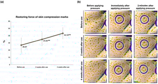 Skin elasticity denotes structural integrity and skin aging leads to evident decreases in skin elasticity restoration ability. The elastic restoring force of skin significantly increased (p < 0.01) after 2 weeks and 4 weeks of use of the test product when compared to before use, as demonstrated in Table 6. The data are also graphically represented in Figure 4a,b.