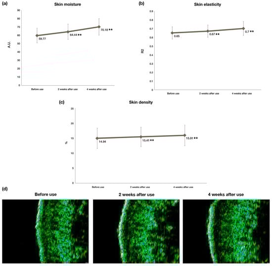 Loss of skin density is associated with skin aging, leading to thinner skin and decreased skin elasticity []. In this study, the skin density (SD, %) was determined with a skin scanner. The dermis is thicker and has a brighter green color when the SD value is higher, which suggests that the skin has better density. A lower SD score, on the other hand, denotes poor skin density and as a result, the dermis is thinner. As demonstrated by Figure 5c, we can conclude that the skin density improved significantly (p < 0.01) with a mean increase of 6.5% after 4 weeks of product use. The skin scanner images shown in Figure 5d also show that after application of the test product, the thickness of the dermis increased.