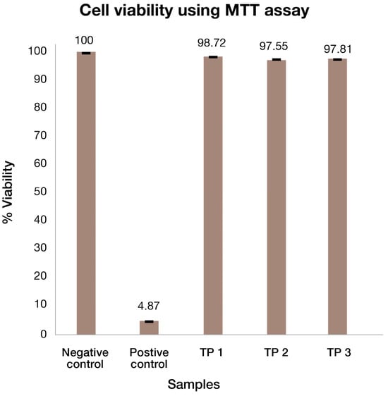 The percentage viability of positive and negative control was 4.87% and 100%, respectively. Overall cell viability of >95% is considered to show that there are no toxicity issues with skin tissue []. This test showed that all three NF products are not toxic to the cells and thus would not cause any toxicity to skin tissues. The studied DermaLayr™ NF products are, therefore, safe for use on human skin.
