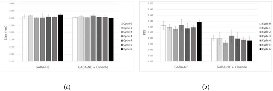 Droplet size (a) and PDI value (b) of GABA−loaded nanoemulsions, both with and without the penetration enhancer, following multiple heating–−cooling cycles (mean ± SD, n = 3).