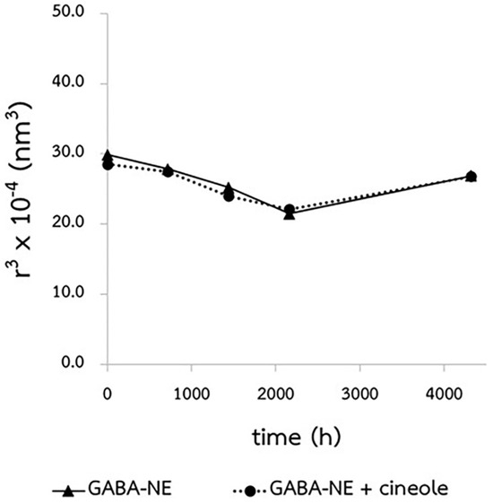 Ostwald ripening plot of the GABA−loaded nanoemulsions with and without the penetration enhancer, conducted at 40 °C.