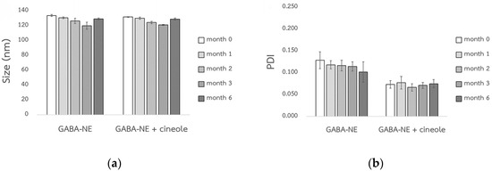 The Ostwald ripening rates (ω) for GABA−loaded nanoemulsions, with and without the penetration enhancer, were virtually negligible when stored at 40 °C, as indicated by the nearly zero slopes (0.0001 and −0.0002 nm³/h) in Figure 3. When compared to their initial sizes, the droplet sizes of these GABA−loaded nanoemulsions did not alter, either with or without the penetration enhancer (Figure 4a). Furthermore, as shown in Figure 4b, both variations of the GABA−loaded nanoemulsions showed a narrow size distribution of droplets (PDI). These findings confirm that all GABA−loaded nanoemulsions exhibited exceptional physical stability when stored for a minimum of six months at 40 °C.