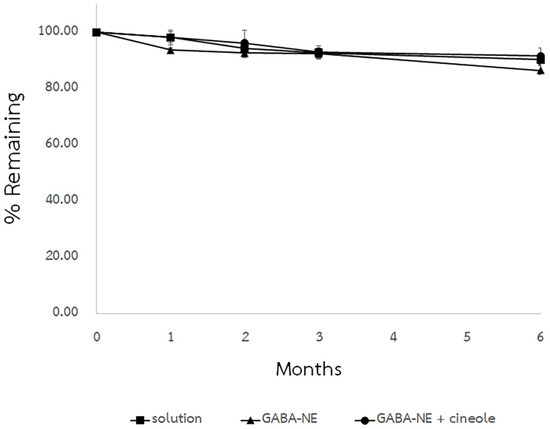 Under accelerated conditions (40 °C), the formulations showed a gradual decline in the remaining percentage of GABA, as depicted in Figure 5. After 6 months, the remaining GABA percentages in the solution and the GABA−loaded nanoemulsions with and without the enhancer dropped to 90.38 ± 2.06%, 91.65 ± 2.93%, and 86.54 ± 1.69%, respectively. However, the high percentage of retained drug labels suggested acceptable chemical stability. This reduction might be linked to potential GABA degradation induced by long−term heat exposure, a phenomenon previously documented [17].