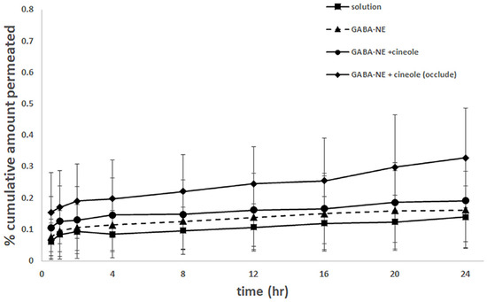 The permeation profiles of GABA solution, GABA−loaded nanoemulsions, GABA−loaded nanoemulsions with the penetration enhancer, and GABA−loaded nanoemulsions with the penetration enhancer under occlusion (mean ± SD, n = 4).