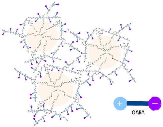 Electrostatic interaction of GABA with nonionic surfactants. The negative end of GABA (−COO−) is represented by a purple circle with a minus sign, and the positive end (−NH3+) by a blue circle with a plus sign.