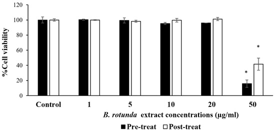Cell viability percentage of 3T3-L1 cells pre- and post-treatment with different concentrations of B. rotunda extract for 48 h. Data are presented as mean ± S.D. (n = 3). * denotes a significant difference from the control group (untreated cells) (p < 0.05).