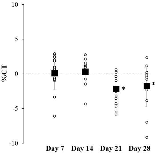 Percentage change in thigh circumference (%CT) after applying B. rotunda extract in a body-firming product to the skin of healthy volunteers for 28 d. Symbols: ○ presents the value of each volunteer and ■ presents as mean ± S.D. (n = 15). * denotes a significant difference from Day 7 (p < 0.05).