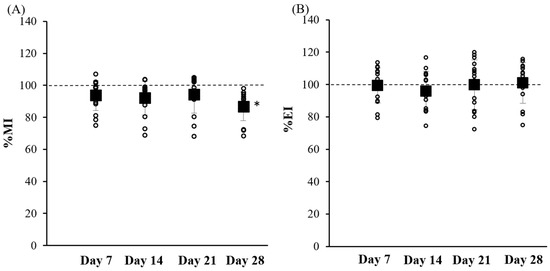 (A) Melanin index (%MI) and (B) erythema index (%EI) values after applying the B. rotunda extract body-firming product to the skin of healthy volunteers for 28 d. Symbols: ○ presents the value of each volunteer and ■ presents as mean ± S.D. (n = 15). * denotes a significant difference from Day 7 (p < 0.05).