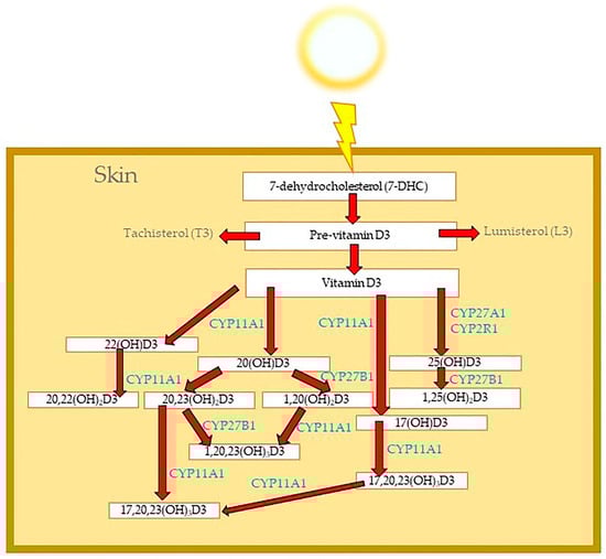 Vitamin D metabolites are also activated in the skin cells [20,30], including fibroblasts [32,57] and keratinocytes [31]. Skin is also a target organ where vitamin D regulates many skin cells functions, thus making it a unique organ within the endocrine system [11]. The formation of vitamin D in the skin involves UVB-induced transformation of 7DHC to pre-vitamin D3, with further transformation to D3 configuration that is accelerated by an increased temperature [1,11,25,26]. Keratinocytes and fibroblasts produce 25(OH)D3 [12] and the hormonally active form of vitamin D3, 1,25(OH)2D3 [26], through the pathway shown in Figure 1.