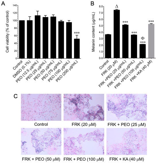 The murine melanoma (B16–F10) cell line was procured from the American Type Culture Collection (ATCC, Manassas, VA, USA). Cells were cultured in RPMI-1640 medium supplemented with glucose, penicillin, and streptomycin, and 10% FBS. They were grown in 10 cm culture dishes and incubated in a humidified atmosphere containing 5% CO2 at 37 °C. The sub-culturing of cells was performed at three-day intervals. Cell viability was assessed using the MTT colorimetric assay. B16–F10 cells were seeded in a 96-well plate at a density of 1 × 104 cells/well. After 24 h of incubation, cells were treated with various concentrations (25, 50, 100, 150, and 200 μg/mL) of PEO or 25–100 μM PA or 20 μM FRK for an additional 48 h. Control cells were treated with 0.1% DMSO/RPMI for 48 h. After removing the cell culture supernatant, 1 mg/mL of MTT in 200 μL of fresh culture medium was added. The resulting MTT formazan crystals were dissolved in 200 μL of DMSO. Subsequently, the samples were measured at 570 nm (A570) using an ELISA microplate reader (Bio-Tek Instruments, Winooski, VT, USA). The percentage of cell viability was determined using the following formula: (A570 of treated cells/A570 of untreated cells) × 100.