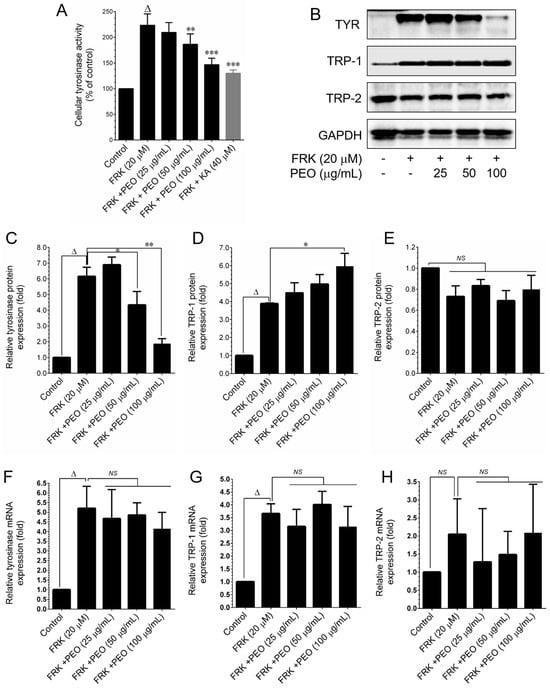 The effect of PEO on FRK-induced cellular tyrosinase and melanogenesis regulatory proteins in B16–F10 cells. Cells were treated with increasing concentrations of PEO or KA and stimulated with FRK for 48 h. (A) Enzymatic measurement of cellular tyrosinase activity was performed using l-DOPA as a substrate, and the effects on l-DOPA oxidation velocity were measured at 492 nm. (B–E) Western blot analysis determined the protein expression levels of tyrosinase (TYR), TRP-1, and TRP-2. The histogram illustrates the relative protein expression, normalized with the loading control GAPDH. (F–H) q-PCR analysis assessed the relative mRNA expression levels of tyrosinase, TRP-1, and TRP-2. The data, presented as the mean ± SD of three independent experiments, indicate statistical significance, Δ p < 0.001, of the control vs. FRK; * p < 0.05, ** p < 0.01 and *** p < 0.001 indicate significance between the PEO and FRK treatment groups. Patchouli essential oil (PEO), forskolin (FRK), kojic acid (KA), tyrosinase (TYR), tyrosinase-related protein 1,2 (TRP-1,2), Glyceraldehyde 3-phosphate dehydrogenase (GAPDH), and non-significant (NS).