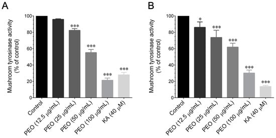 The ex vivo mushroom tyrosinase assay utilized l-tyrosine and l-DOPA as substrates for tyrosinase activity. The inhibitory activity of PEO and PA against the tyrosinase-catalyzed oxidation of l-tyrosine was determined following the method outlined by Chang [14]. In brief, a 40 μL volume of 1.5 mM substrate (l-tyrosine) dissolved in 0.1 M phosphate buffer (pH 6.8) was combined with 120 μL of 0.1 M phosphate buffer. To this mixture, 20 μL of different concentrations of PEO (12.5–100 μg/mL) or PA (12.5–100 μM) were added. Following this, 20 μL of mushroom tyrosinase (2000 U/mL in phosphate buffer) was introduced to initiate the reaction. The assay mixture was then incubated at 37 °C for 15 min. A microplate reader (μQuant, BioTek Instruments, Winooski, VA, USA) was employed to monitor the increase in absorbance at 475 nm, indicative of dopachrome formation. The inhibitory effect of PEO and PA on mushroom tyrosinase in l-DOPA oxidation was assessed. A mixture of 100 μL of 0.1 M phosphate buffer and 20 μL of different concentrations of POE (5–100 μg/mL) or PA (12.5–100 μM) was prepared. Following that, 20 μL of mushroom tyrosinase (2000 U/mL in phosphate buffer) was added to initiate the reaction. The mixture was then incubated at 37 °C for 5 min before introducing 40 μL of l-DOPA (4 mM in 0.1 M of phosphate buffer). Subsequently, the mixture underwent incubation for an additional 10 min at 37 °C, and the absorbance, at 475 nm, of the reaction mixture was recorded. As a positive control, kojic acid (40 μM) was employed for the assay. The percentage inhibition of l-tyrosine or l-DOPA oxidation was calculated using the following formula: % inhibition = 100 − (B/A × 100), where A = ΔOD475 over 10 min without the sample, and B = ΔOD475 over 10 min with the tested sample.