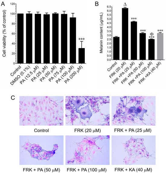 The effects of PA on melanin synthesis in B16–F10 cells. (A) Cells were incubated with increasing doses of PA (12.5–200 µM) for 48 h, and cell viability was assessed using an MTT colorimetric assay. The results, presented as the mean ± SD of three independent experiments, indicate statistical significance (*** p < 0.001) when comparing the control and PA treatment groups. (B) Cells were treated with increasing doses of PA (25–100 µM) or KA (40 µM) in the presence of 20 µM FRK for 48 h, and their melanin content was quantified from their total cell lysates. (C) Following a 48 h treatment with PA and FRK, cells were stained using Fontana–Masson staining to visualize their subcellular melanin content. The data, representing the mean ± SD of three independent experiments, indicate statistical significance (Δ p < 0.001 when comparing the control to FRK; Φ p < 0.05 between the PA and control groups; *** p < 0.001 between the PA/KA and FRK treatment groups). Dimethyl sulfoxide (DMSO), patchouli alcohol (PA), forskolin (FRK), and kojic acid (KA).