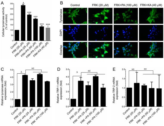 B16–F10 cells (2 × 104 cells/well) were cultured on Nunc Lab-Tek® cell culture slides (ThermoFisher Scientific, Waltham, MA, USA) and subjected to treatment with FRK, with or without PA (100 µM) or KA (50 µM), for 24 h. Following treatment, the culture media were aspirated, and the cells were fixed in 2% paraformaldehyde for 15 min. Following fixation, the cells were permeabilized with 0.1% Triton X-100 for 10 min, washed, and then blocked with 10% FBS in PBS. Following this, the cells were incubated for 2 h with anti-tyrosinase antibody in 1.5% FBS. The cells were subsequently incubated with the fluorescein isothiocyanate (FITC)-conjugated secondary antibody for an additional 1 h in 6% bovine serum albumin (BSA). Following that, the cells were stained with 1 µg/mL of DAPI for 5 min, washed with PBS, and visualized using a fluorescence microscope (Olympus Corp., Tokyo, Japan) at 20× magnification.