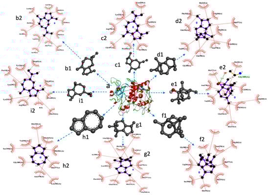 Molecular docking of tyrosinase with major components of PEO. (a) 3D structure of human tyrosinase (AF-L8B082-F1); (b1) 3D structure of α-bulnesene; (b2) docked pose of AF-L8B082-F1 and α-bulnesene: (c1) 3D structure of α-guaiene; (c2) docked pose of AF-L8B082-F1 and α-guaiene; (d1) 3D structure of β-patchoulene; (d2) docked pose of AF-L8B082-F1 and β-patchoulene; (e1) 3D structure of patchouli alcohol; (e2) docked pose of AF-L8B082-F1 and patchouli alcohol; (f1) 3D structure of seychellene; (f2) docked pose of AF-L8B082-F1 and seychellene; (g1) 3D structure of δ-patchoulene; (g2) docked pose of AF-L8B082-F1 and δ-patchoulene; (h1) 3D structure of azulene; (h2) docked pose of AF-L8B082-F1 and azulene; (i1) 3D structure of δ-guaiene; and (i2) docked pose of AF-L8B082-F1 and δ-guaiene.
