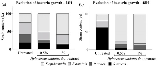 This study aimed at evaluating the effect of the H. undatus fruit extract on the population balance of a model coculture of four bacterial species: Staphylococcus epidermidis (ATCC #12228, Manassas, VA, USA); Staphylococcus hominis (ATCC #27844); Staphylococcus aureus (ATCC #6538); and Propionibacterium acnes (ATCC #11827). For the purposes of this study, the former two species represent commensal/beneficial bacterial populations, while the latter two represent detrimental/pathogenic populations. Each strain was initially grown alone in specific media: Tryptone soya broth (Oxoïd CM0129, Thermo Fisher Scientific, Waltham, MA, USA) for Staphylococcus species and Brucella broth (Condalab 1223, Madrid, Spain) for Cutibacterium acnes.