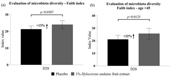 Evaluation of microbiota diversity (mean +/− SEM) according to Faith’s index (a) in the whole participant group; (b) in participants aged over 45 years—showing improvements in phylodiversity with the product containing 1% H. undatus fruit extract.