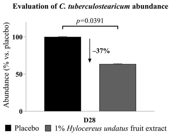 Corynebacterium tuberculostearicum abundance, reduced after 28 days’ treatment with the product containing 1% H. undatus fruit extract (mean +/− SEM).