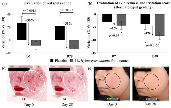 1% H. undatus fruit extract in formula showed strong efficacy on red spot counts when compared to placebo: −35% at D28, and −36% at D7, with statistical significance vs. placebo in both cases (Figure 4a). Compared to D0, the reduction in red spot counts was statistically significant at D28 only (variations with placebo were not statistically significant vs. D0). These data indicate reduced skin inflammation with the active product. This is borne out by the results of clinician grading, which show a small (4%) but statistically significant improvement in redness/irritation grades at D28 vs. placebo and D0 with 1% H. undatus fruit extract in formulation (Figure 4b). Figure 4c,d show illustrative Visia photographs, demonstrating the effect on red spots and skin redness.