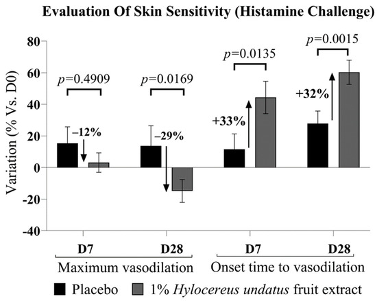 Upon histamine challenge, microcirculation data (Figure 5) showed a strong advantage for 1% H. undatus fruit extract in formula over placebo at D28, both in terms of onset time (time required to reach maximum irritation) and in terms of peak irritation—exhibiting, respectively, a 32% delay in onset time and a 29% drop in maximum amplitude. This effect is statistically significant vs. placebo and D0. At D7, an advantage for the active formulation’s effect on onset time is already observable and significant vs. placebo and D0. The active formulation’s advantage in terms of maximum irritation is observable as a trend at D7, but is not yet statistically significant. In this test, irritation was observed as an increase in microcirculation; therefore, a reduction in the peak value and an increase in onset time indicate anti-inflammatory effects.