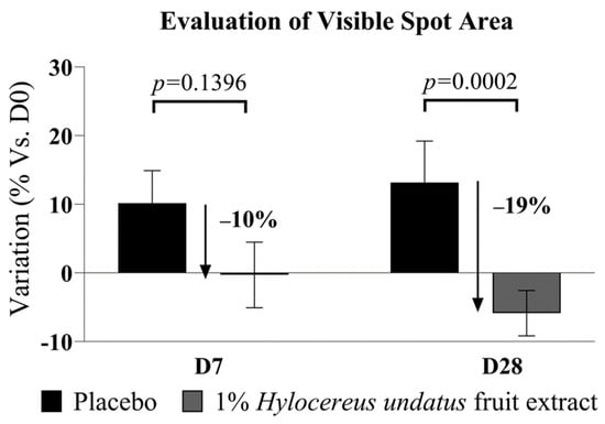Finally, 1% H. undatus fruit extract in formula shows an advantage vs. placebo in visible spot areas at D28 (−19% vs. placebo, with statistical significance vs. placebo) (Figure 6). At D7, a somewhat smaller advantage is already observable, but not yet statistically significant. This result indicates that treatment with the extract reduces uneven skin pigmentation.