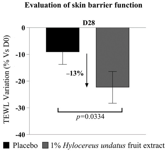 The Tewameter data (Figure 7) show a significant improvement in skin barrier with 1% H. undatus fruit extract in formula, as a reduction in TEWL at D28 (−13% vs. placebo), with statistical significance vs. D0 and vs. placebo—indicating that treatment with the extract reinforces the skin barrier.