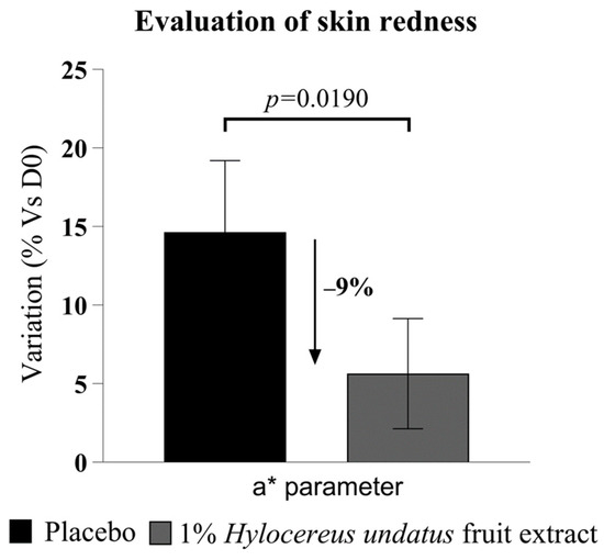 Evaluation of skin redness, as Hunter color space parameter a* (mean +/− SEM), showing reduced skin redness with the product containing 1% H. undatus fruit extract.