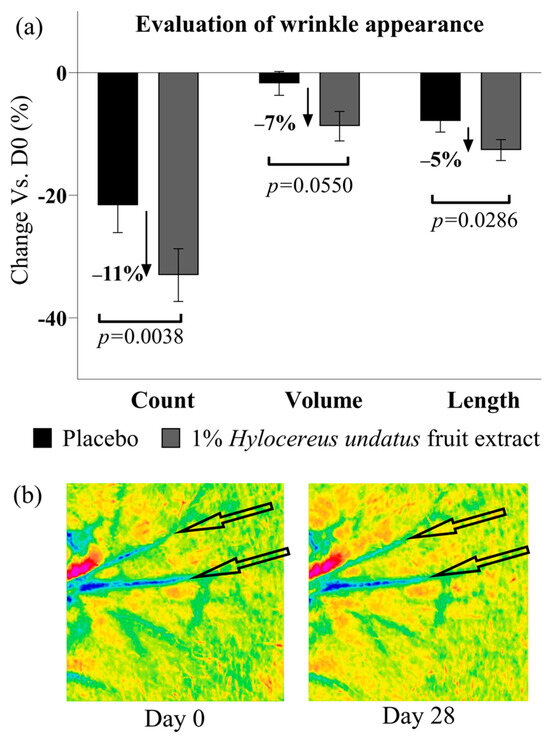 (a) Evaluation of skin wrinkles in the crow’s feet area (next to the corner of the eyelids) by PRIMOS: wrinkle count (left), volume (center), and length (right) (all shown as mean +/− SEM), showing an ani-wrinkle effect with the product containing 1% H. undatus fruit extract. (b) Illustrative Primos false-color depth map images, volunteer #16 (age 42). Arrows indicate features of interest.