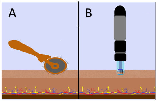 Representative images of (A) Dermaroller and (B) Dermapen when applied to the skin.