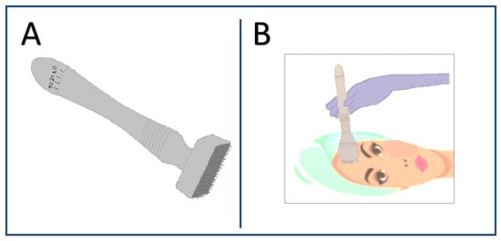 Microneedling using microneedling devices such as Dermaroller and Dermapen (Figure 1) in cosmetic applications is gaining prominence, particularly for improving the skin’s appearance and treating blemishes and scars [25,26,27,28,29]. The use of these devices has continuously evolved since their origin in the early twentieth century. Recently, dermatologists introduced microneedling in anti-aging and rejuvenation therapy to achieve smooth and young-looking skin [28]. These devices puncture the skin with micron-sized needles in a non-pathogenic manner, causing the underlying cells to produce more collagen and elastin, the crucial dermal components [28,30,31]. In addition, these devices have been used to enhance the delivery of cosmetic agents [31,32,33].