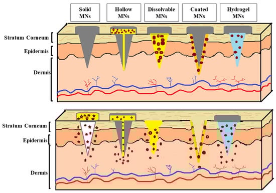 Various topical/transdermal delivery platforms, such as nanoparticles, liposomes, dendrimers, gels, creams, lotions, patches, nanoemulsions, and microemulsions, have been widely used to deliver cosmetic agents to the skin [5,6]. However, these delivery platforms often cannot cross the major barrier of the skin, the stratum corneum (SC), hindering the penetration of the chemical molecules through the skin layers [7,8,9]. Additionally, this barrier limits the penetration of the hydrophilic and high-molecular-weight molecules (>500 Da) through the intact skin [10,11,12]. This will ultimately increase the frequency of application of the delivery platforms onto the skin so that a sufficient amount of cosmetic agents can penetrate the skin layers (epidermis and dermis), leading to poor patient compliance [1].