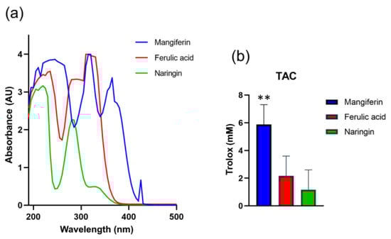It is well documented that the molecular damage caused by UVR is closely accompanied by oxidative stress generated through an impaired balance between the generation of free radicals (ROS) and the ability to neutralize them by antioxidant mechanisms [19]. When analysed for total antioxidant capacity (TAC), all three compounds showed significant antioxidant potential at a 1% (w/v) concentration. The antioxidant power was 5.88 mM for mangiferin, 2.17 mM for ferulic acid, and 1.17 mM for naringin in terms of Trolox power, indicative of a strong protective potential for the ingredients against UVR-induced oxidative damage (Figure 1).