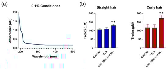 UV-protective capacities of the conditioner. (a) Spectral absorbance profile of 0.1% conditioner; (b) TAC of hair keratin extracts prepared from control, UV-irradiated and conditioner-treated hair, demonstrating the increased antioxidant effect of the conditioner on curly hair. Error bars are mean ± SEM, n = 3, with statistically significant outputs ** where p < 0.01 in one-way ANOVA with post-hoc Tukey HSD test.