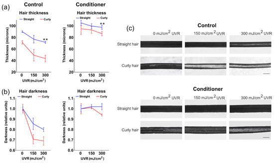 Protective capacities of the conditioner against structural damage of hair fibre by UVR. (a) A decrease in hair thickness after exposure to increasing doses of UVR, particularly prominent in curly hair, is prevented by pre-treatment of both hair types by the conditioner; (b) bleaching of the hair caused by UVR is also more pronounced in curly hair, where pre-treatment of both hair types with the conditioner prevents the loss of hair darkness due to irradiation. Error bars are mean ± SD, n = 3, with statistically significant outputs ** where p < 0.01 in one-way ANOVA with post-hoc Tukey HSD test; (c) light microscopy images of hair samples (10× lens magnification, scale bar is 100 μm).
