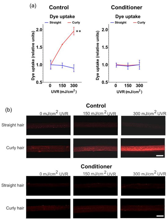Enhanced penetration of harmful molecules to damaged textured hair is prevented by the conditioner. (a) Uptake of rhodamine B after irradiation of hair with increasing doses of UV is significantly increased in curly hair compared to straight hair. Both hair types are resistant to rhodamine B after pre-treatment with the conditioner before UV irradiation. Error bars are mean ± SD, n = 3, with statistically significant outputs ** where p < 0.01 in a one-way ANOVA with post-hoc Tukey HSD test; (b) fluorescence microscopy images of hair samples (10× lens magnification, scale bar is 100 μm).