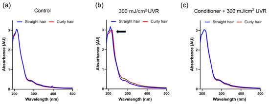 To obtain more insights into the molecular basis of the microscopic changes recorded in the assays, we analysed the spectral absorbance of the keratin extracts obtained from control and UVR-treated straight and curly hair fibres with or without pre-treatment with the conditioner. The hair samples were irradiated with UV light at a dose of 300 mJ/cm2 and subjected to alkaline extraction as described before, which extracts mostly keratins [20]. Measurements of the spectral absorbance of the 0.01% (v/v) extracts within the 200–500 nm spectrum revealed similar profiles for both the control straight and curly hair, with a peak in absorbance of 210 nm corresponding to hair keratins within the region of 200–250 nm as described before [22]. Irradiation of hair fibres with UVR resulted in visible differences in spectral absorbance profiles, characterised by a significantly reduced 210 nm peak in the textured hair extract, indicative of the presence of structural changes to keratin caused by UVR exposure. Significantly, these changes were absent when the hair was pre-treated with the conditioner before irradiation, with both spectral absorbance profiles for straight and textured hair appearing similar (Figure 5).