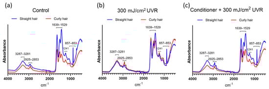 ATR-FTIR spectra of hair samples with defined absorption bands related to specific molecules and chemical bonds. The main absorption bands were detected as hydroxyl groups (3287–3281 cm−1), alkane groups (2925–2924 cm−1), lipid acyl CH2 groups (2858–2853 cm−1), amide I (1639–1636 cm−1), amide II (1532–1529 cm−1) and amide III (1241 cm−1) corresponding to keratins and S-OR esters (857–853 cm−1). Alterations in the molecular arrangement and quantities of the chemical bonds are reflected by differences in absorbance and band displacement. (a) Control hair; (b) UV-irradiated hair; (c) hair pre-treated with the conditioner before irradiation.