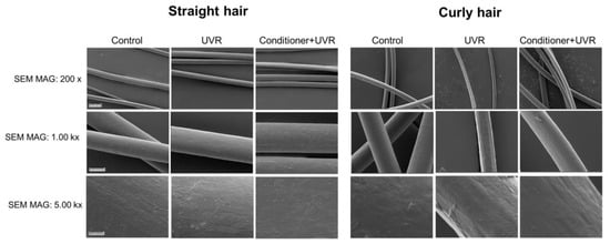 Scanning electron microscopy (SEM) images of straight and textured hair after exposure to UV irradiation alone or with pre-treatment with the conditioner. The images were recorded at SEM magnifications of 200×, 1.00 kx and 5.00 kx. Scale bars are 200 μm for the upper panel, 50 μm for the middle panel and 10 μm for the lower panel.