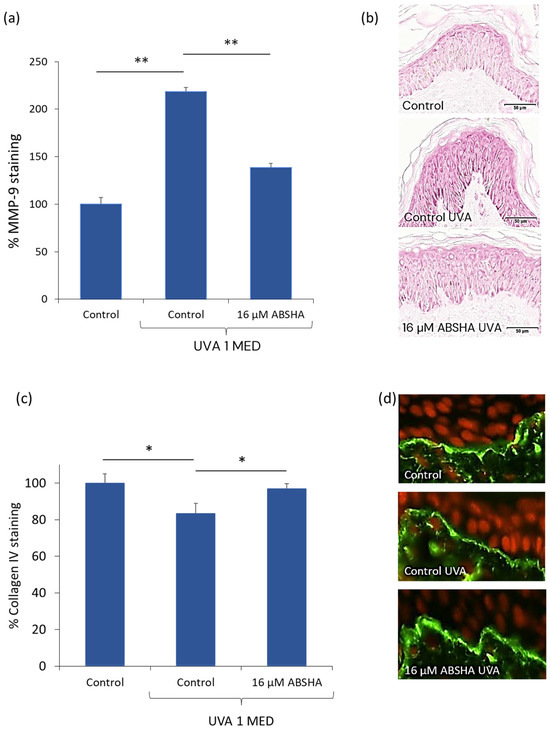 To investigate the effect of plasmin on the functional effects of MMP-9 expression ex vivo, we induced MMP-9 by UV-irradiation in skin tissue and monitored both the MMP-9 expression and collagen IV degradation. We showed that MMP-9 is increased by UV-irradiation in skin explants by 2.18-fold. Adding ABSHA inhibited the expression of MMP-9 to 1.39-fold (Figure 1a), which is visible in the staining of the explants (Figure 1b). To see whether this has an impact on the downstream targets of MMP-9, we investigated collagen IV expression in UV-irradiated skin explants. We found a significant reduction of total collagen IV by 17% (p < 0.05). In the presence of the inhibitor peptide ABSHA, this downregulation was almost completely inhibited (Figure 1c), which is also seen in the staining of the explants (Figure 1d).
