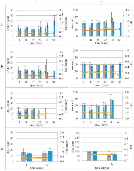 Stability study of emulsions (I) and nanoemulsions (II) during storage at 4 °C (a), 25 °C (b), and 45 °C (c) and accelerated aging (three 24 h circles of storage at 45 °C and 25 °C) (d). Size distribution: mean droplet size of empty (■) or loaded with LEO (■) and uniformity or PdI describing size distribution width of emulsions or nanoemulsions, empty (x) or loaded (●) with LEO, respectively.