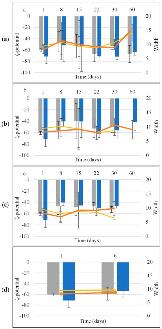 Mean ζ-potential and width of NE (■, x) and NEL (■, ●) during storage at 4 °C (a), 25 °C (b), and 45 °C (c) and accelerated aging (three 24 h circles of storage at 45 °C and 25 °C) (d).
