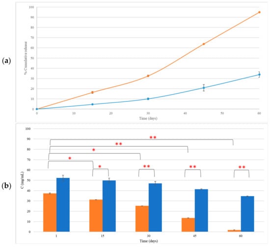 The release rate (a) and concentration of LEO incorporated in CEL (■) and NEL (■) (b) over a period of 60 days after storage. * p < 0.05, ** p < 0.005.