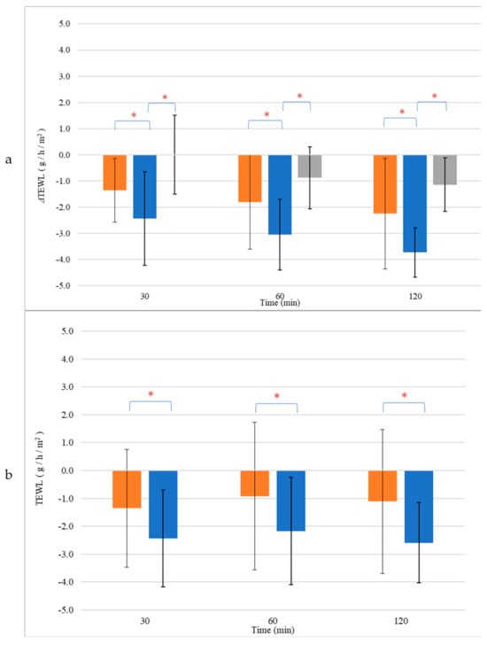 Transepidermal Water Loss (TEWL) change (a) and normalized values (b) of skin treated with CEL (■) and NEL (■) or left untreated (■). * p < 0.05.