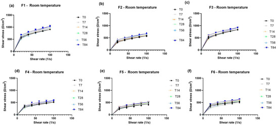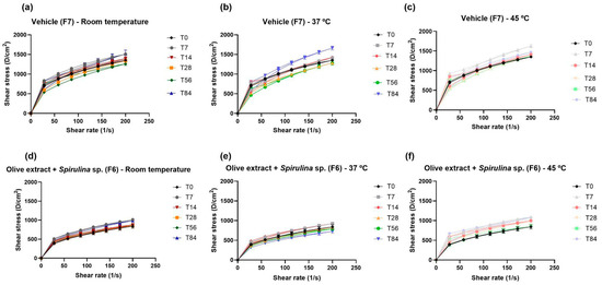 Rheograms of formulations with or without Sodium Metabisulfite (SMBS) in the presence of olive extract alone or in association with Spirulina sp. when stored at room temperature for (T0), 7 (T7), 14 (T14), 28 (T28), 56 (T56), and 84 (T84) days. F1 = formulation without SMBS with 0.5% w/w olive extract at room temperature (a); F2 = formulation with SMBS with 0.5% w/w olive extract at room temperature (b); F3 = formulation without SMBS with 0.2% w/w of olive extract at room temperature (c); F4 = formulation with SMBS with 0.2% w/w of olive extract at room temperature (d); F5 = formulation with SMBS with 0.5% w/w olive extract and 0.1% w/w Spirulina sp. at room temperature (e); and F6 = SMBS formulation with 0.2% w/w olive extract and 0.1% w/w Spirulina sp. at room temperature (f).