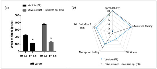 Work of shear of the vehicle (F7) and formulation containing the association of olive extract with Spirulina sp. (F6) at pH 6.5 and 5.5 (a) and sensory analysis of these formulations at pH 5.5 (b). * Statistically different means when compared to the pH 6.5 value (p < 0.05).