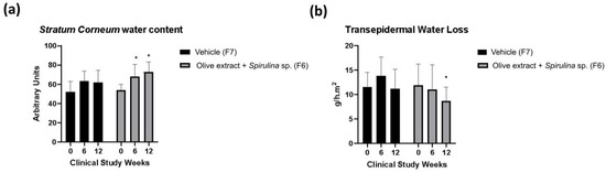 Stratum corneum water content (a), and transepidermal water loss (b) before (T0), after 6 (T6w), and 12 (T12w) weeks of use of the vehicle (G1–F7) and association with olive extract and Spirulina sp. (G2–F6) formulations. * Significant difference from baseline values (T0) (p < 0.05).