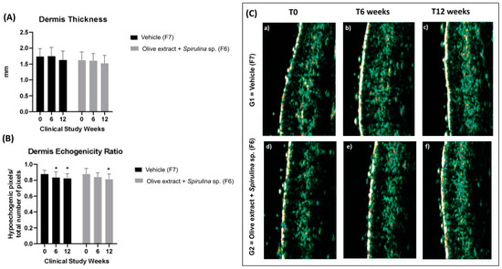 (A) Dermis thickness before (T0), after 6 (T6w), and 12 (T12w) weeks of use of the vehicle (F7) and association with olive extract and Spirulina sp. (F6) formulations; (B) dermis echogenicity ratio (hypoechogenic pixels/total number of pixels) before (T0), after 6 (T6w), and 12 (T12w) weeks of use of the vehicle and association with olive extract and Spirulina sp. formulations; (C) representative 20 MHz ultrasound images of dermis echogenicity before (T0), after 6 (T6w), and 12 (T12w) weeks of use of the vehicle (G1–F7) and association with olive extract and Spirulina sp. (G2–F6) formulations (echogenicity color scale: white > yellow > red > green > blue > black) * Significant difference from baseline value (T0) (p < 0.05).